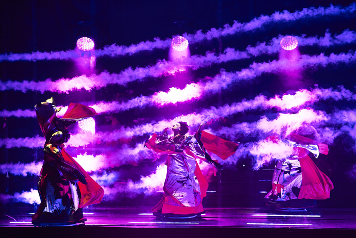 Com muita fumaça e mistério, gueixas apareceram e dançaram num palco inusitado: permitia que as bailarinas girassem muito com a ajuda de algo mecânico e que ficassem de cabeça para baixo, presas pelos pés. A coreografia narrou uma história na minha cabeça: foi como se aquelas gueixas fossem muito fortes e tivessem sobrevivido aos problemas históricos do Japão e aos fenômenos naturais. Esse momento foi muito forte para mim. Eu fiquei emocionada e envolvida pela atmosfera do devaneio que tive a liberdade de criar. No final dessa performance, as gueixas foram levadas pelo vento e ficaram de ponta cabeça até as luzes se apagarem.